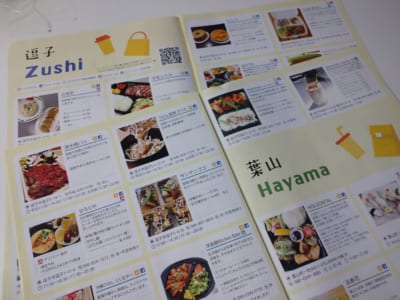 ガイドブックには 逗子は40店舗。葉山は 11店舗の美味しそうなメニューの写真、ランチタイム、ディナータイム、テイクアウト可能な時間帯、デリバリーOK、ズーバーイーツ(QRコード付き)注文可能のマークが掲載されています。