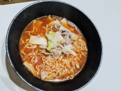 エリンギ、ネギ、牛肉、ラーメンを入れて煮込むだけなのですが、とてもお洒落な魚介テイストのラーメンとなりました。