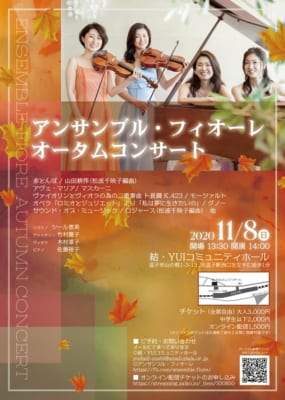 今回のコンサートは 2年前の秋に、結・YUIコミュニティホールで開催された「アフタヌーンコンサート」の第2弾。 逗子在住の作曲家、徳永洋明さんの曲や、同じく逗子在住の作曲家、松波千映子さんがアンサンブル・フィオーレ編成の為に編曲をして下さった「赤とんぼ」など、YUIホールのYOUTUBE動画で披露された曲と、デュオやトリオなど、違う編成の曲をクラシック中心に演奏します。