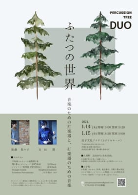 PERCUSSION TREE DUO 「ふたつの世界 音楽のための打楽器と、打楽器のための音楽」は1月14日(木)19時開場 19時半開演 15日(金)18時半開場 19時開演 逗子文化プラザさざなみホール 入場料3000円