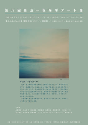 ※国の「緊急事態宣言」を受けた「特措法に基づく緊急事態措置に係る神奈川県実施方針」を踏まえ、2021年1月12日(火曜)より、しおさい博物館の臨時休館としおさい公園の臨時休園が、1月8日決定いたしました。 これを受け「第八回葉山一色海岸アート展」の開催も12日から一旦お休みしますが、緊急事態宣言解除後に、改めて10日間ほどの日程で再開する予定です。