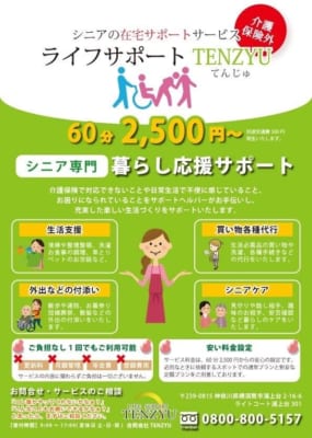 ライフサポートTENZYUとは、介護保険適用外のシニア専門、生活サポートサービスの会社です。 介護保険で対応できないことや日常生活で不便に感じていること、お困りになられていることをサポートヘルパーがお手伝い。シニアとそのご家族の充実した楽しい生活づくりをサポ ートいたします。