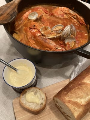 マヨネーズとにんにくのすりおろし、レモン汁を加えてよく混ぜます。作りやすい分量と比率はマヨネーズ大さじ3、にんにくのすりおろしはお好みで小さじ1/3くらい、レモン汁小さじ1〜2杯ぐらい。お好みでレモンの皮をすりおろしても、さわやかで美味しいです! そしてバケットに、そのアイオリを塗って、ブイヤベースを乗せて食べる!今回はエビとあさり・タラの切り身を入れてみました。
