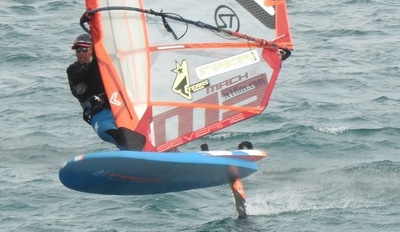 ↑ 津久井浜でフォイルウインドで走る、ティーアズの香村プロ。