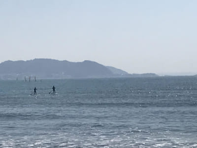 ウインドサーフィンが何艇か出ていく中、SUPがバランスを取りながら
