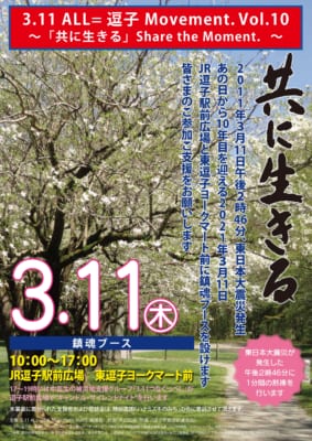 東日本大震災の発生から10年となる3月11日(木)、JR逗子駅前と東逗子ヨークマート前で鎮魂ブースが設けられます。午前10時から午後5時まで。 そして午後2時46分に1分間の黙とう