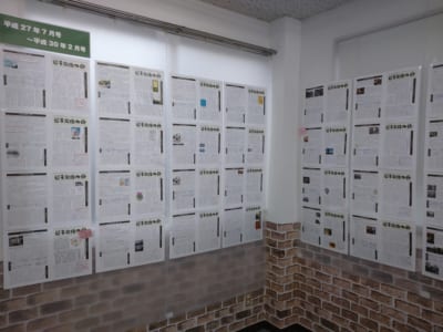 「逗子文化の会 ニュースレター100号」展 〜逗子の文化をたどりましょ〜 では 100号分をすべて壁に貼って展示。希望があれば、ほしい号をカラーで出力することもできます。創刊号から順に見ることで、そのときどきの逗子が見えてきます。 執筆者もバラエティに富んでおり、だれがどんな思いを持っているかも感じられます。高橋幸子さんはニュースレターの題字を掘ってくださった木版画家。 高橋幸子さんの関連グッズや永橋為成さんの絵はがき、「知っ得ずしQ&A」の販売も あります。