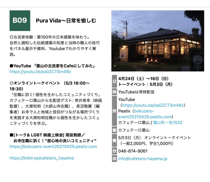 そして5/3 18:00-19:30 トークライブもあります。「住職に訊く!個性を生かしたコミュニティづくり」 カフェテーロ葉山から生配信 ゲスト: 常井美幸(映画監督)、大塚知明(大師山寺住職)、⻑沼敬憲(編集者) お寺で人と地域と信仰がつながる場所づくりを実践する大塚知明住職から 個性を生かした コミュニティづくりを学ぶ。ファシリテーターはサイエンスライターの⻑沼敬憲さん