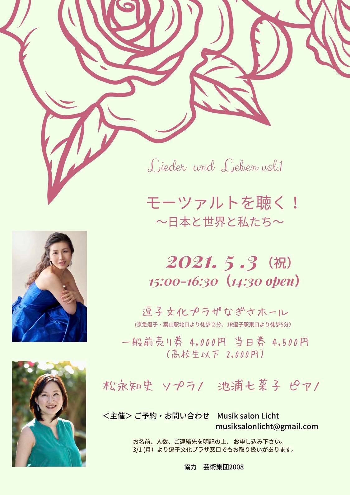 「モーツアルトを聴く!~日本と世界と私たち」5月3日に 逗子文化プラザなぎさホールで開催!ゲストは逗子出身のピアニスト・池浦七菜子さん。池浦さんにはコンサート会場で何度もお目にかかっていますが ご出演はなんと10年ぶり。