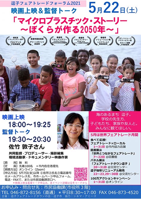 5月22日(土)18時~参加費は無料です。お申し込みは7日以降。先着100名。逗子市との共催なので、逗子市のHPまたは市民協働課に電話かファックスで