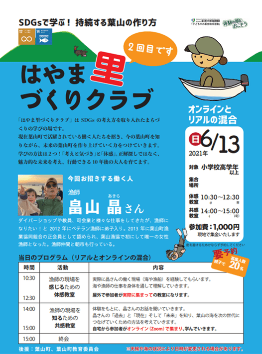 次回は 6月13日(日)オンラインとリアルに行います。今度は、里海です。お招きする大人は葉山漁協の漁師、畠山晶さんです。