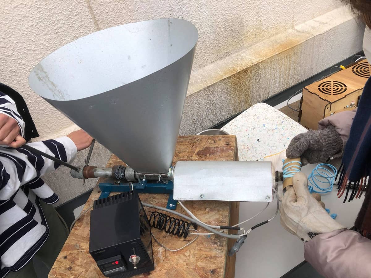 PP逗子では 粉砕機とプラスティックを溶かして再形成して利用する機械 を導入しました。エクストリュージョン/押出形成で ひも状にだしてカゴみたいなものを作ったり。プラスチックを足してゆくことができるために棒状の金型に流し込むなどで大量のプラスチック利用した材を作ることなどに向いているとのこと。