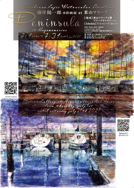 今日から葉山マリーナギャラリーで「Peninsula 藤井陽一郎 水彩画展」が開催されています。 ゲストは 逗子在住のグラフィックデザイナーの藤井陽一郎さん