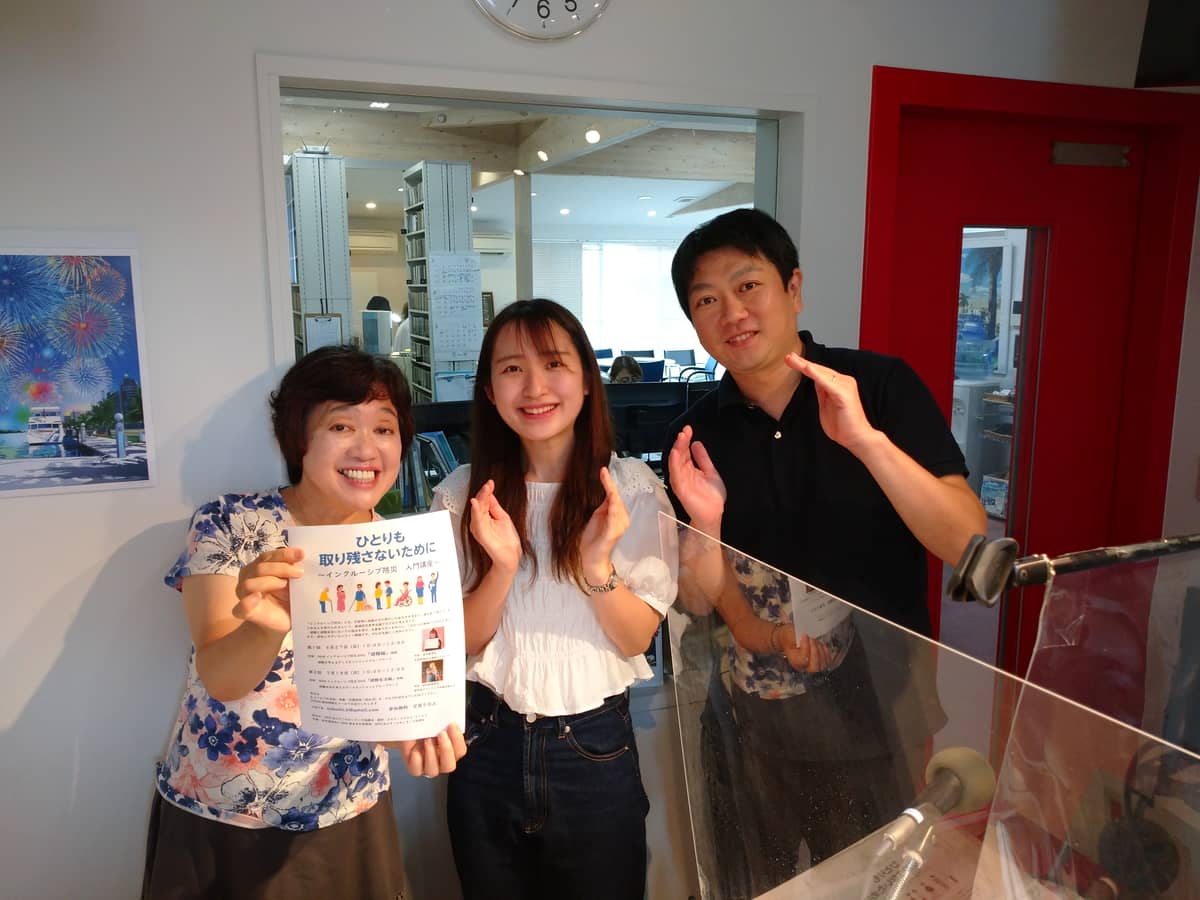「ひとりも取り残さないために~インクルーシブ防災入門講座」について インクルーシブ防災キャラバン実行委員長で大学生防災士の栗原ひとみさんと NPO法人すこやかいきいき協議会代表の服部誠さんがゲストでした。