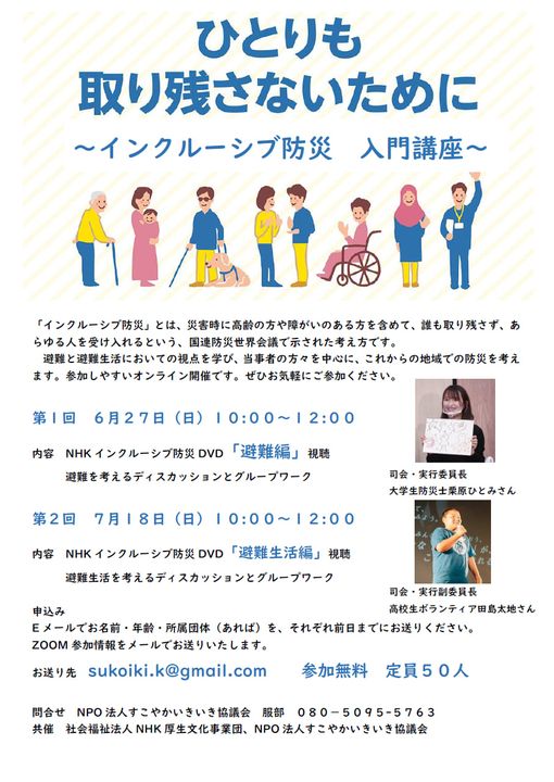 今回の企画「ひとりも取り残さないために~インクルーシブ防災入門講座」は 2011年の東日本大震災では、多くの高齢者・障害者の命が失われました。障害者の死亡率は住民全体の死亡率の2倍にのぼり、避難ができずに逃げ遅れた人が多くいたことが推察されました。今後、防災・減災を考える際には、地域で、避難時に配慮が必要な人たちとともに計画をたて、訓練を重ねて、ひとりひとりに即した準備を地域ぐるみで教職して取り組んでゆくことが求められます。 誰ひとり取り残さないインクルーシブ防災は、どのようにしたら実現できるのか。一足早く取り組みをすすめている事例などを学習し、逗子葉山地域に活かすことができないかを考え、企画いたしました。 その中心になるメンバーとしては、認知症の当事者の方とご家族、視覚障害のある方、身体障害のある方の3名を中心として実行委員会を組織しています。 実行委員長の大学生防災士栗原ひとみさん、副委員長の中高生防災チーム3.11つなぐっぺしの高校1年生の田島大地くんが尽力してくれています。