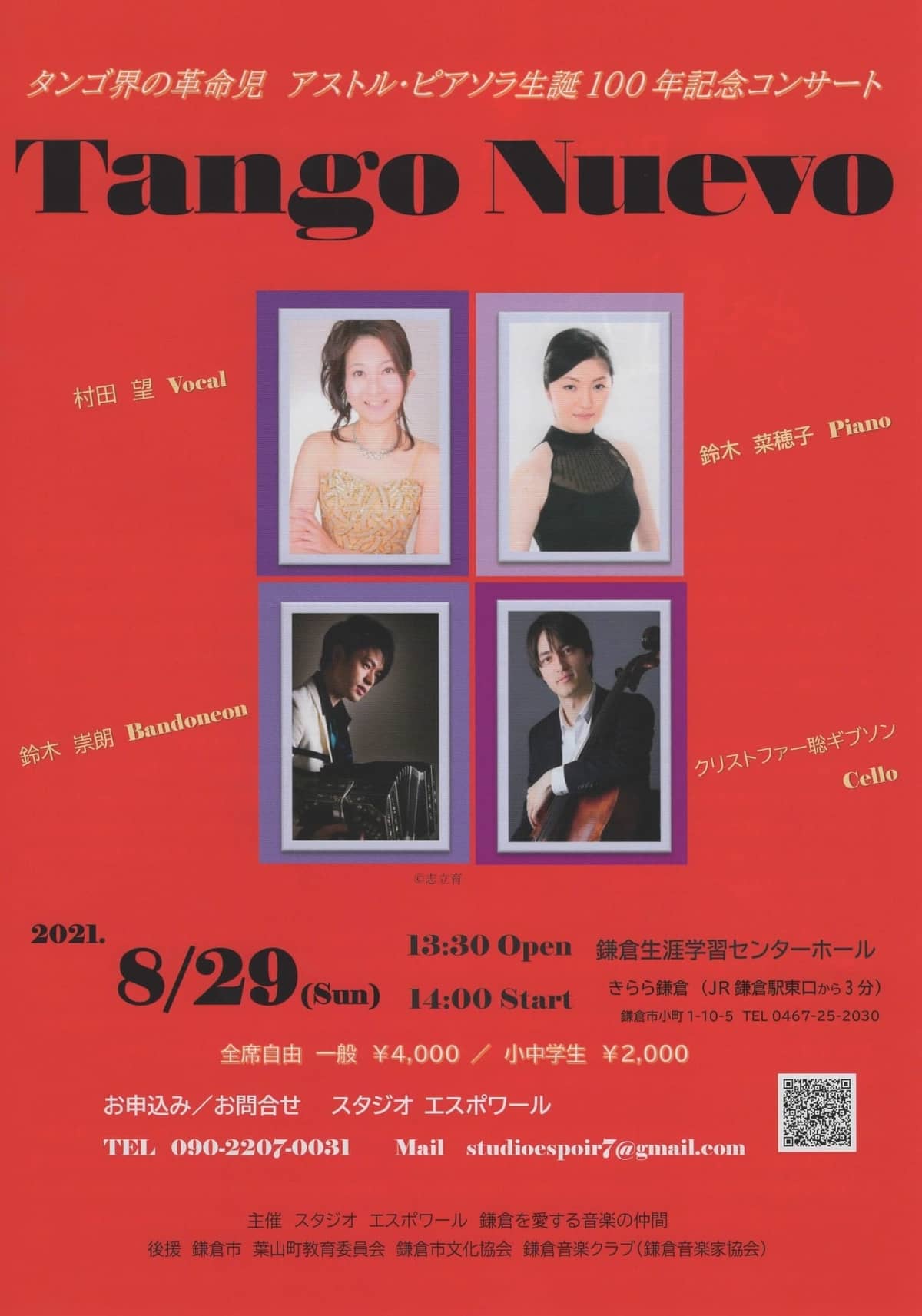 出演者 村田望(歌) 鈴木崇朗(バンドネオン) クリストファー・聡・ギブソン(チェロ) 鈴木菜穂子(ピアノ)