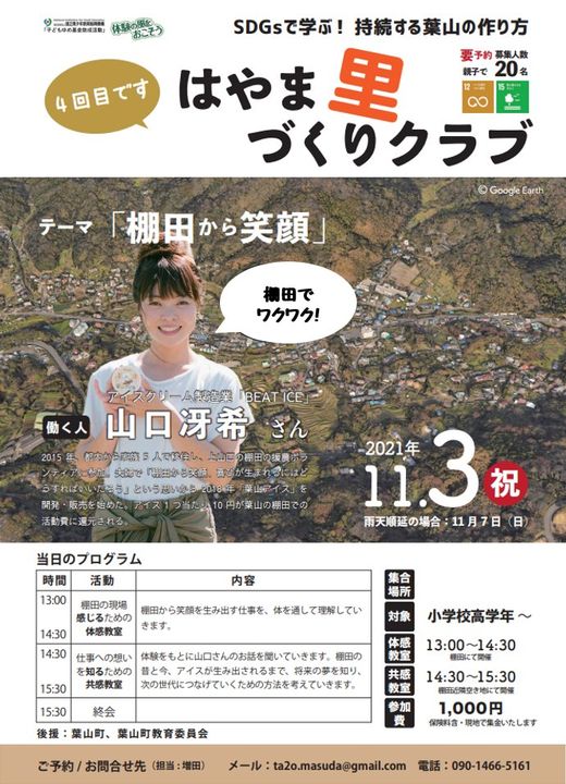 14:50ごろ~15:30 共感教室 体験をもとに山口さんに里山の役割や大切さをお話しいただき、棚田からワクワクすることを考えます。
