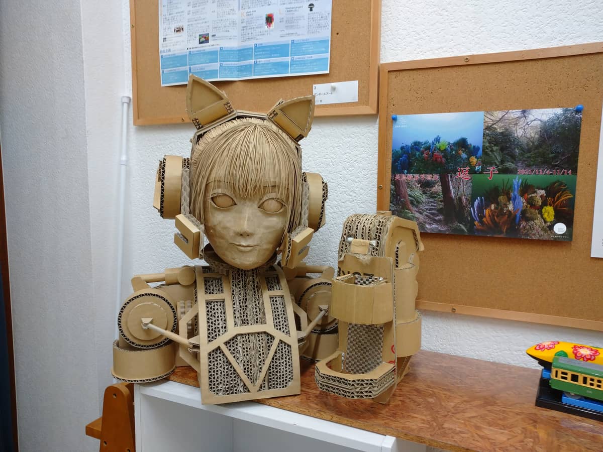 山口さんは キングコーポレーション入社後、経理業務を経て2018年レンタルギャラリーオープンに伴い室長に就任。 室長就任後、宣伝活動として作品づくりを始め、趣味であるイラストや模型をショーウィンドーに展示。 2020年よりダンボールアートを制作しました。