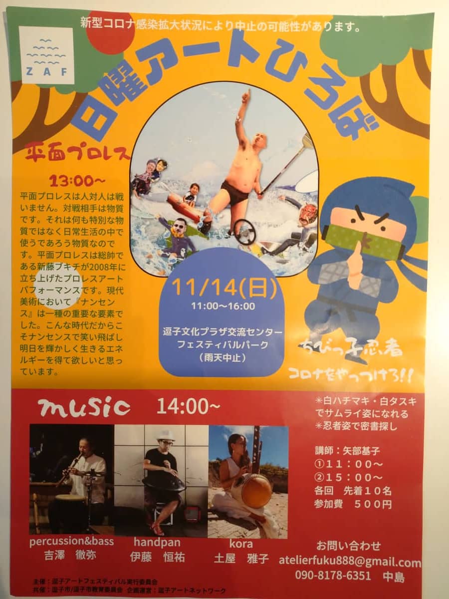 押し寄せてくる日常に疲れていませんか?無感動になっていませんか? 日常のその向こう側にある超日常空間を体験してみませんか? 日曜日の昼下がりにバカバカしいプロレスや、美しいハンドパンの音楽、忍者とともに超日常を創出します。(雨天中止の場合あり)