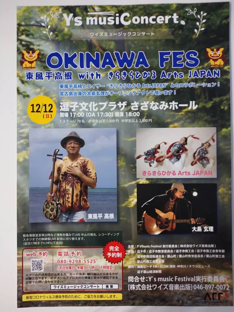 さらに!12月12日(日) 逗子文化プラザさざなみホールで OKINAWA FES 東風平高根 with きらきらひかるArts JAPAN