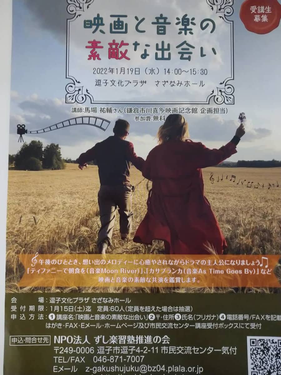 「映画と音楽の素敵な出会い」が1月19日(水)逗子文化プラザさざなみホールで開催されます。 ゲストは NPO法人ずし楽習塾 七海耕一さん とオールディーズを歌う会 秋間幸代さん。
