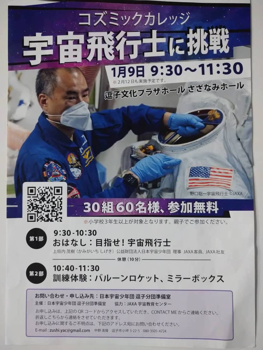 「コズミックカレッジ 宇宙飛行士に挑戦」1月9日(日)と2月12日(土)逗子文化プラザさざなみホールで開催!日本宇宙少年団逗子分団準備室の中野清隆さんをゲストにお迎えしました。