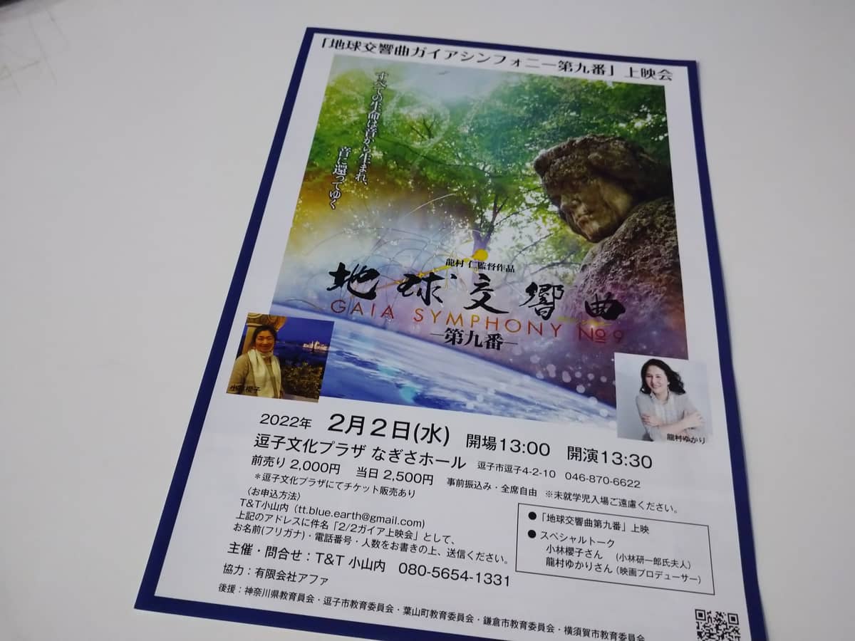 「地球交響曲ガイアシンフォニー第九番」上映会 ~ すべての生命は音から生まれ、音に還ってゆく ~ 地球交響曲の最終章「第九番」は 2月2日(水曜日) 開場13:00 開演13:30 (終了予定17:00) 【会 場】逗子文化プラザ なぎさホール 【料 金】前売2,000円 当日2,500円(全席自由。事前振込み) ※未就学児の入場はご遠慮願います。 【ゲスト】小林櫻子さん・龍村ゆかりさん お申込み・お問合せ: 小山内 (tt.blue.earth@gmail.com)