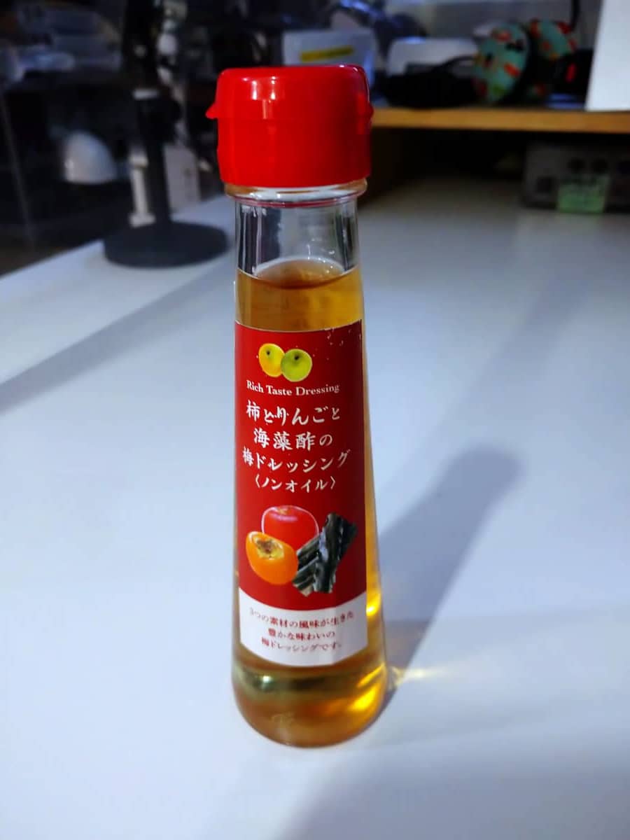 そして新商品「柿とりんごと海藻酢のノンオイル梅ドレッシング」についてお話しいただきました。