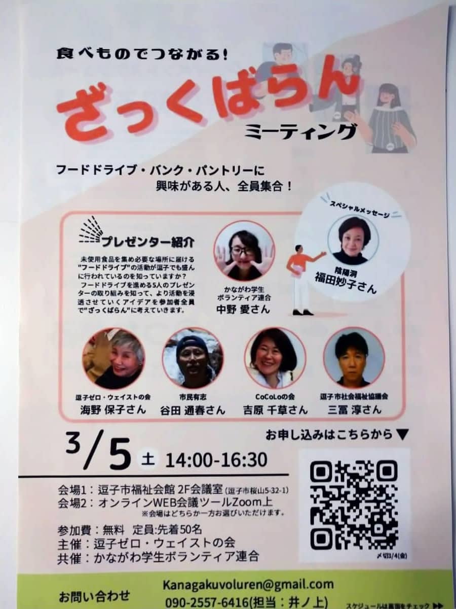 食べものでつながる!ざっくばらんミーティングは 5日(土)14時~逗子市福祉会館2階会議室、またはオンラインWEB会議ツールZOOMで