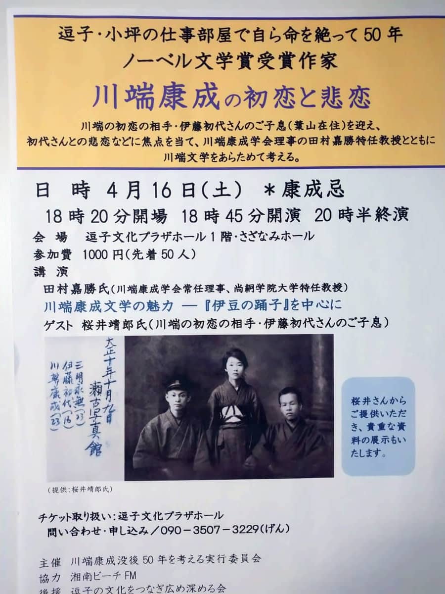 「逗子・小坪の仕事部屋で自ら命を絶って50年 ノーベル文学賞受賞作家 川端康成の初恋と悲恋」講演会が 4月16日に開催されます。 主催の「川端康成没後50年を考える会実行委員会」メンバーで 逗子葉山経済新聞の玄真琴さんにお話いただきました。