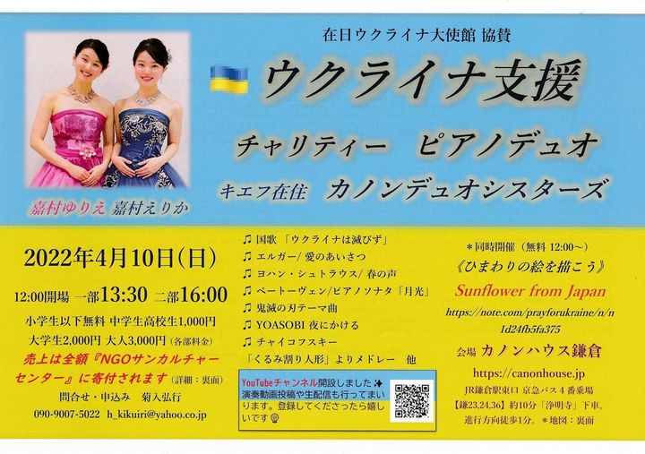 ウクライナ支援 チャリティー ピアノデュオ キエフ在住 カノンデュオシスターズ(嘉村ゆりえ 嘉村えりか)は 開場 12:00 一部 13:30 二部 16:00 小学生以下無料 中学生高校生 1,000円 大学生 2,000円 大人 3,000円 (各部料金)