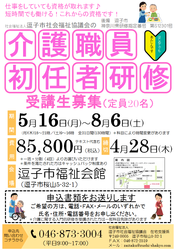 受講料は テキスト代含み 85800円ですが 後援いただいている逗子市市役所さんには市内在住の方または市内の介護事業所に勤務し、 主に身体介護のサービスに従事している方に50,000円の補助をしていただく制度をご用意いただいております。 予算が無くなり次第、助成は終了と伺っておりますので、研修修了後、市役所へご相談ください。 また、インターネットで逗子市介護人材育成事業補助金と検索していただけると概要が確認出来ます。
