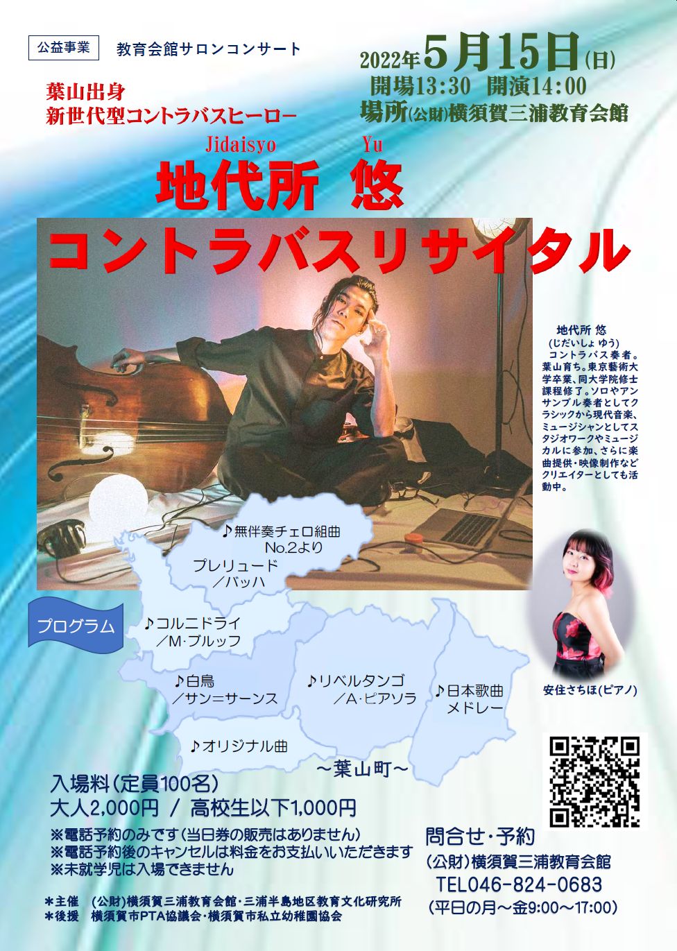 「葉山出身 新世代型コントラバスヒーロー 地代所悠 コントラバスリサイタル」は 5月15日(日)13時半開場、14時開演。場所は公益財団法人 横須賀三浦教育会館。クラシックを中心に、後半は盛り上がる曲、日本歌曲メドレーやオリジナル曲も。楽しいプログラムをご用意しています。ピアノは 安住さちほさん