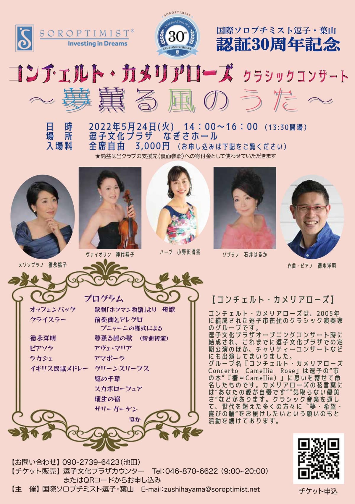 国際ソロプチミスト逗子・葉山 認証30周年記念 コンチェルト・カメリアローズ クラシックコンサートは 5月24日開催!ゲストは 国際ソロプチミスト逗子・葉山の池田泰子さん コンチェルト・カメリアローズのヴァイオリニスト・神代恭子さんです。