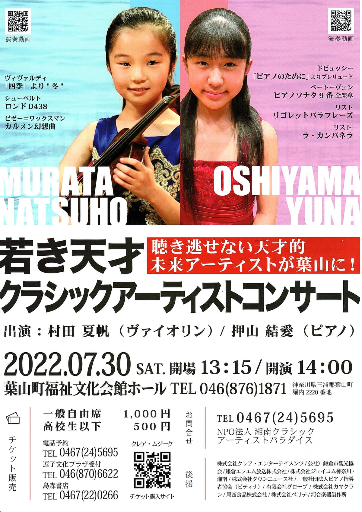 これからが期待される 若きアーティストのコンサート。 7月31日(土)14:00 葉山町福祉文化会館ホール ぜひ、聴きに来てください!