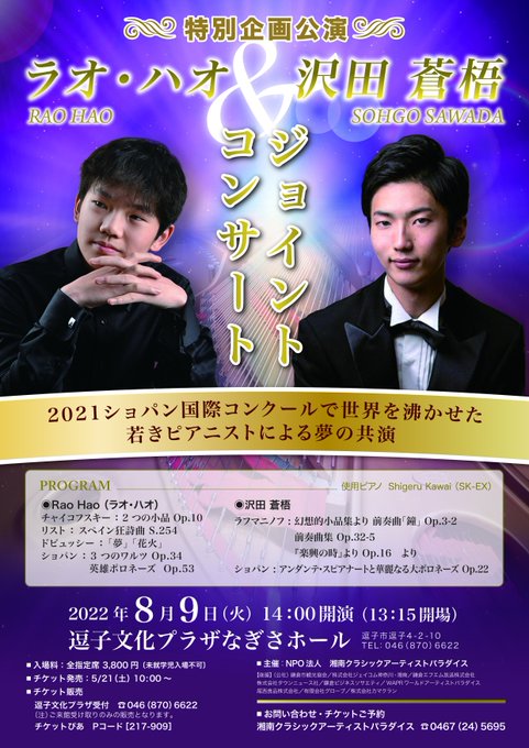 出演者 ・ラオ・ハオ(ピアノ) ・沢田蒼梧(ピアノ)