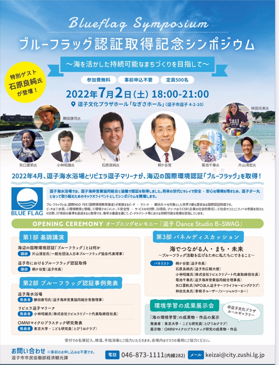 そして!7月2日(土)18時~21時に 逗子文化プラザなぎさホールで ブルーフラッグが海岸の環境活動の旗印となるためのキックオフイベントとして、ブルーフラッグ認証取得記念シンポジウムを開催します。