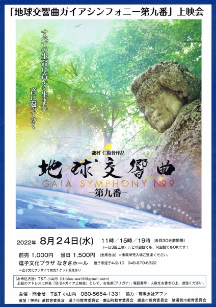 T&Tでは 龍村仁監督のドキュメンタリー映画「地球交響曲」を継続的に上映していますが、ガイアシンフォニー第九番は コロナ禍でも2月2日に逗子文化プラザで上映。無事に開催でき、多くの方がご参加されました。