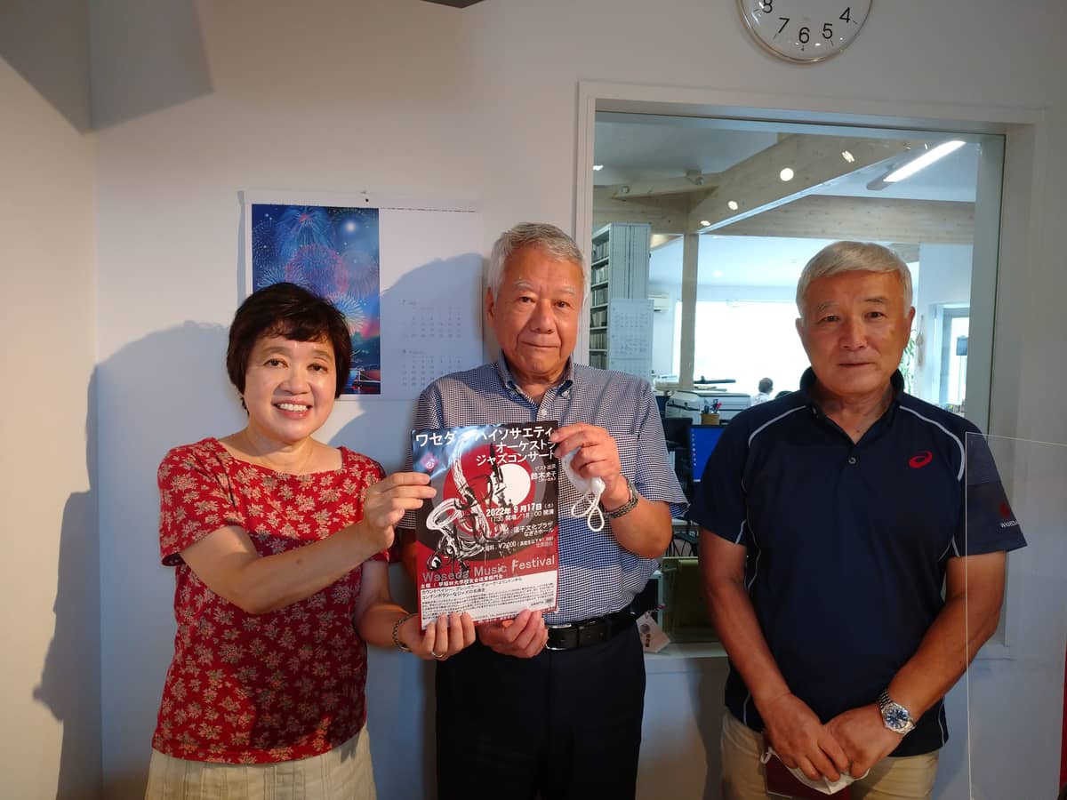 「ワセダ ハイソサエティ・オーケストラ ジャズコンサート」は 9月17日(土)18時~逗子文化プラザ なぎさホールにて 開催されます。 早稲田大学校友会逗葉稲門会 会長の山本陽帳さんと幹事長の荒木孝夫さんをスタジオにお迎えしました。