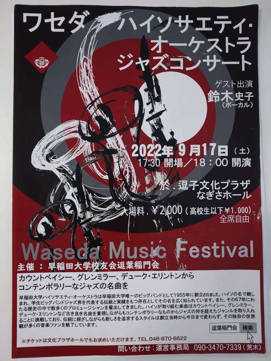 「ワセダハイソサエティオーケストラ」を逗葉地域にお呼びするのは5年ぶり10回目。ハイソサエティ・オーケストラは早稲田大学唯一のビッグバンド(大学公認サークル)として1955年に創立しました。ハイソの名で親しまれ、学生ビッグバンドジャズ界を代表する存在としてその名を広く知られています。その60年に渡る歴史の中で、プロミュージシャンや放送および音楽業界へ数多くの人材を輩出してきました。