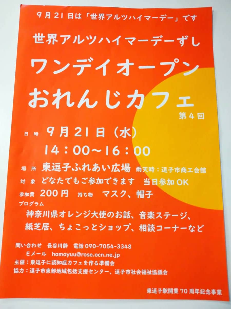 逗子市でも、市役所の社会福祉課や、地域包括支援センターの窓口で、今月はオレンジ色の飾り付けをしたり、認知症関係の資料を多めに置いたりしています。 9月21日の夜には、東逗子駅もライトアップされると聞いていますが、日中には、ワンデイオープンおれんじカフェが開催されます。