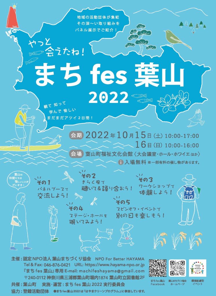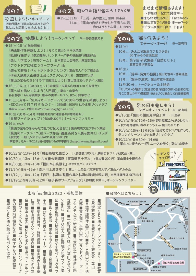 イベントの詳細はNPO葉山まちづくり協会HP、まちfes葉山2022のFBページやインスタをご覧ください。チラシは町内各所、逗子市民交流センターなどに置いてあります。