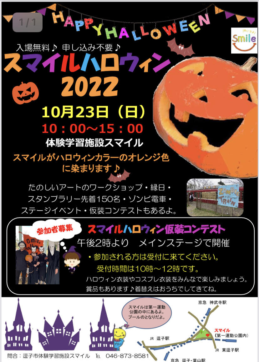 スマイルハロウィンの情報は逗子市子育てポータルサイトえがおHP、体験施設スマイルのInstagramなどで情報が公開されています。