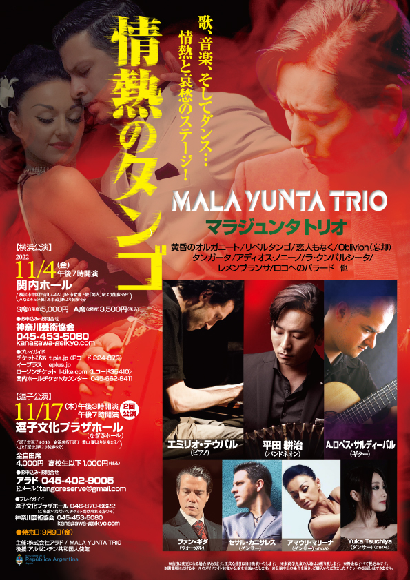 出演者 平田耕治/アリエル・ロペス・サルディーバル/エミリオ・テウバル 問い合わせ先 (株)アラド 045-402-9005 Eメール:tangoreserve@gmail.com