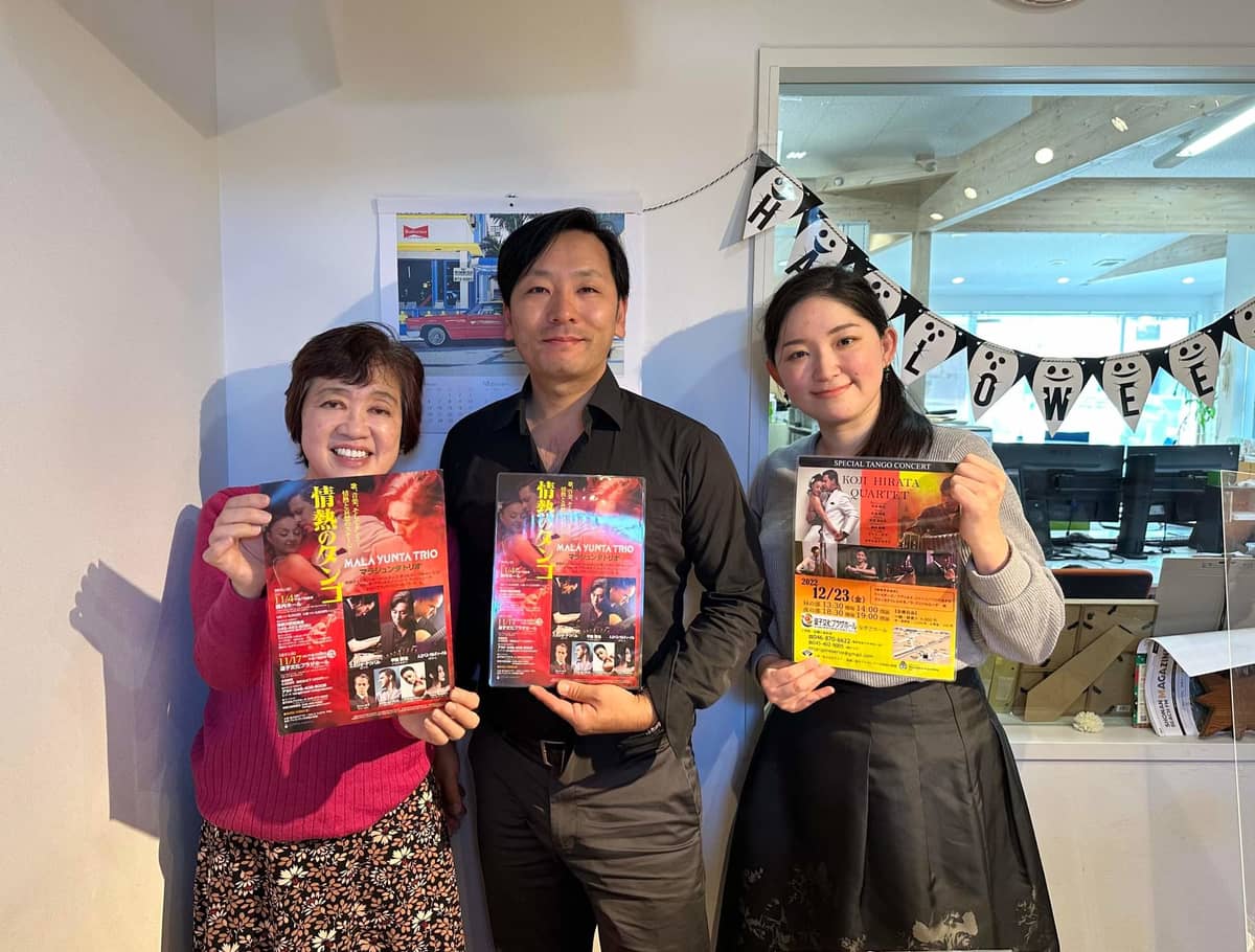 11月のコンサートでは アルゼンチン出身のピアニスト・ギタリストとともに結成した「マラジュンタトリオ」を率いて 情熱溢れるタンゴの名曲を披露します。ギタリストのアリエル・ロペス・サルディーバルさんには 今から9年前に平田さんとご出演、スタジオ内で演奏していただいたのでした。