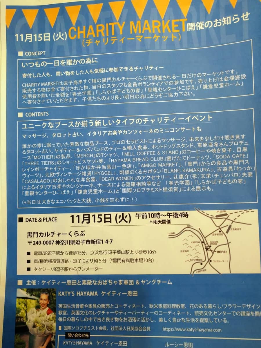 11月15日(火)10:00‐16:00 *雨天開催 場所:黒門カルチャーくらぶ (逗子市新宿1-4-7 )