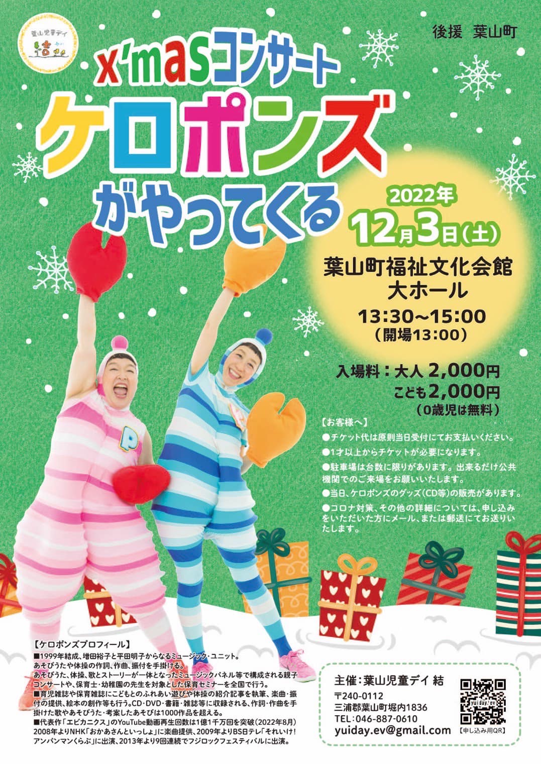 毎年行われていたクリスマスコンサート。これまで参加型コンサートでしたが 形態を変えて 今回鑑賞型コンサートで 開催するにあたり みんなが元気になるコンサートを!ということで ぜひケロポンズに葉山に来て欲しいと思ったそうです。