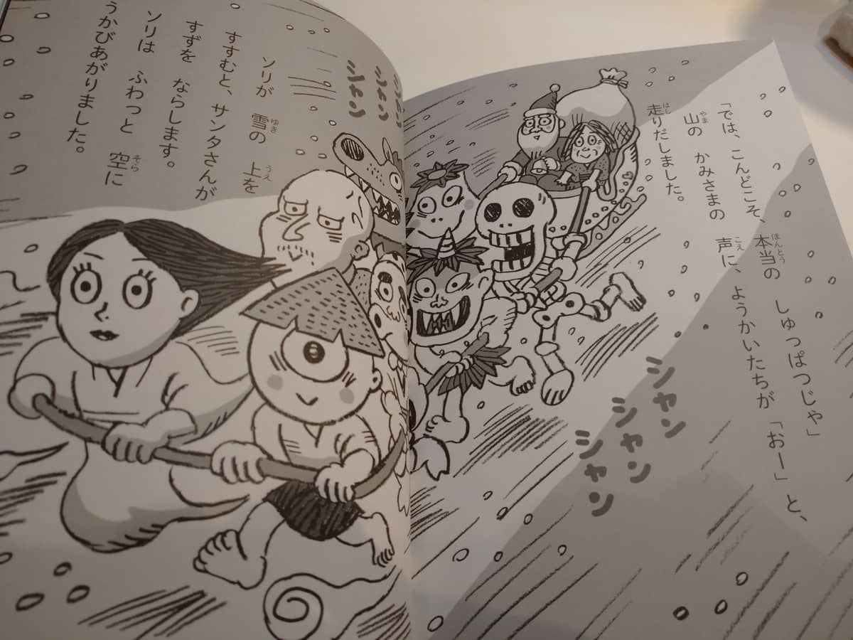 サンタクロースとようかい?という意外な結びつきと思いましたが、南田幹太さんは「世界の最初にクリスマスを迎えるのは、太平洋に浮かぶキリバスだそうです。他にも日本よりも先に日付が変わる国はいくつかあるようですが、人口の多い国では日本がもっとも早くクリスマスを迎えるのではないかと、ある日、思い付きました。 そうなるとサンタクロースはまず最初に日本に来てもおかしくはありません。最初に大きな仕事を終えてしまおうと考えるかもしれないからです。 また最初に日本に来るならば、23日に来て一泊して休養を取ってからイブを迎えるのではないかと思いつきました。これがこの本を書こうと思った、最初のアイディアです」