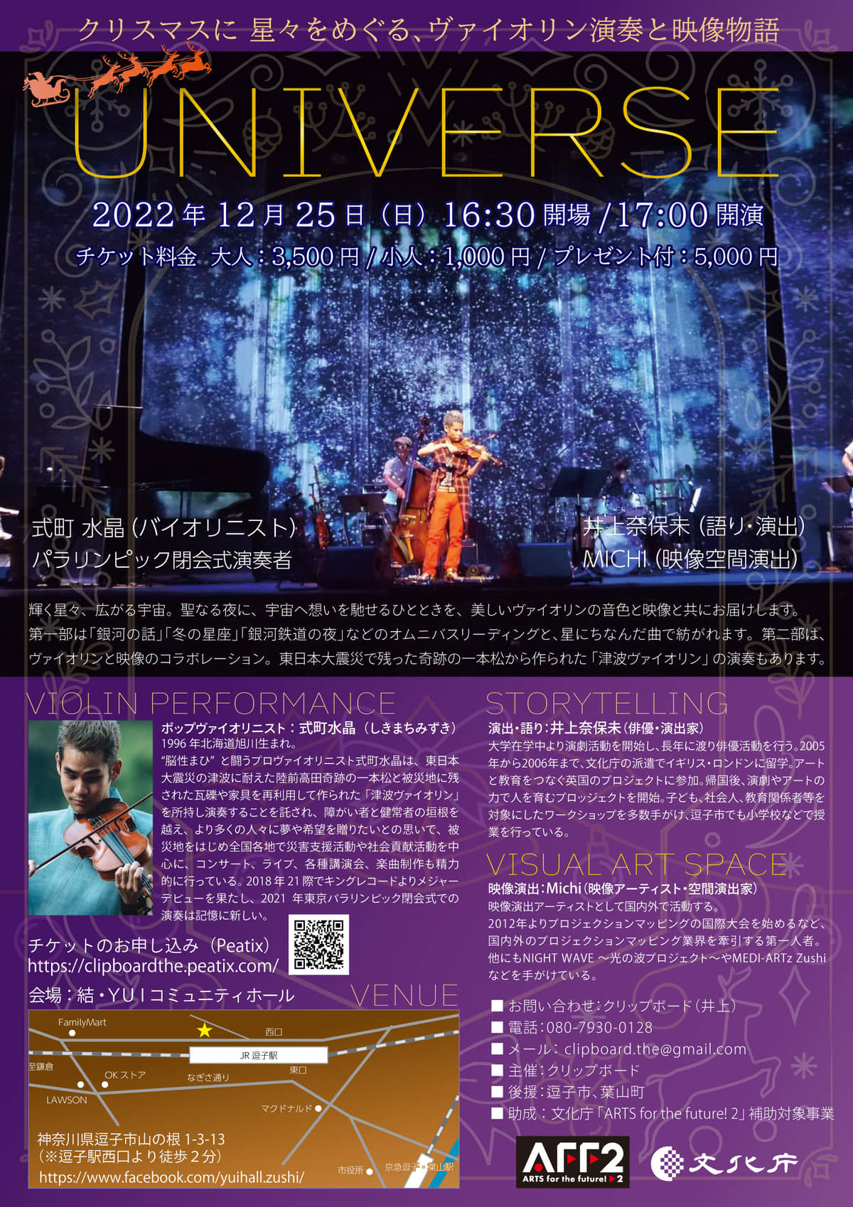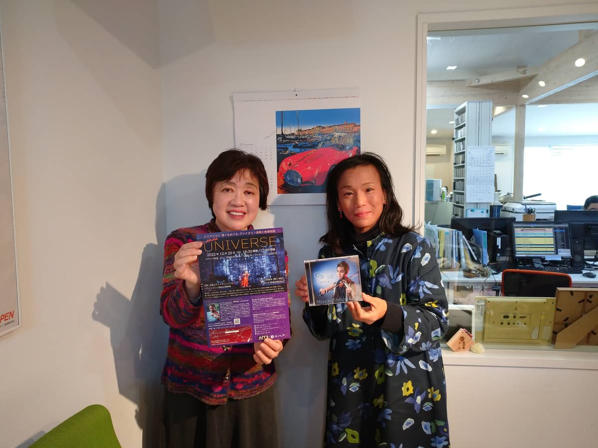 12月25日(日) 結・YUI コミュニティホール(JR逗子駅西口より徒歩2分)にて「 ヴァイオリン演奏と映像物語「クリスマスに星々をめぐる、ヴァイオリン演奏と映像物語UNIVERSE」開催! ポップヴァイオリニスト・式町水晶さん、公演企画をされた俳優・演出の井上奈保未さんに お話うかがいます。 バイオリニスト式町水晶さんは ライブのスぺジュールのため現在立川にいらっしゃるということで お電話でのインタビューでした。
