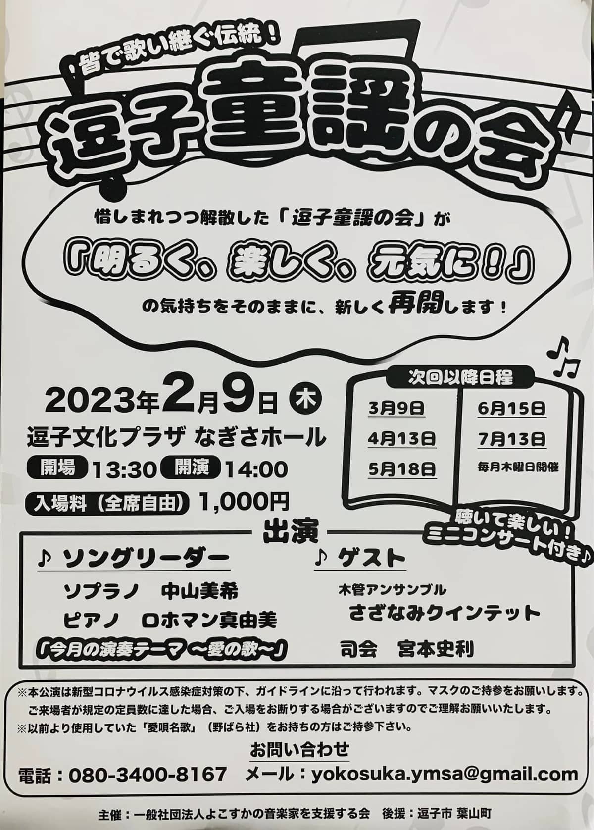 さて 逗子童謡の会というと 月に1回、長年継続して開催され(これまで250回!)かつて番組でもご紹介させていただきました。 それが 2020年6月に解散、惜しむ声も多かったそうです。しかし先月から復活。ロホマン真由美さんが一般社団法人よこすかの音楽家を支援する会との仲介役を担い、運営を引き継ぐことになったそうです。